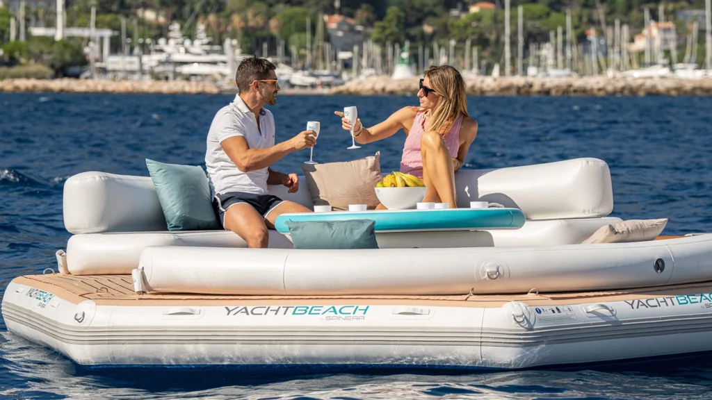 The Pavilion is a unique event structure that combines outdoor charm with indoor comfort. Its drop stitch inflatable design makes it weather-resistant and stylish. It consists of several modular elements, including a base platform with interchangeable floor options, a tent that provides shade and has various top cover options, and an addon for better shade. For maximum comfort, the Pavilion Sofa, Backrest, and table are also available and can be used separately as a comfortable lounge setup on the beach. The Pavilion’s connection to water adds value and creates an enjoyable experience for any event.